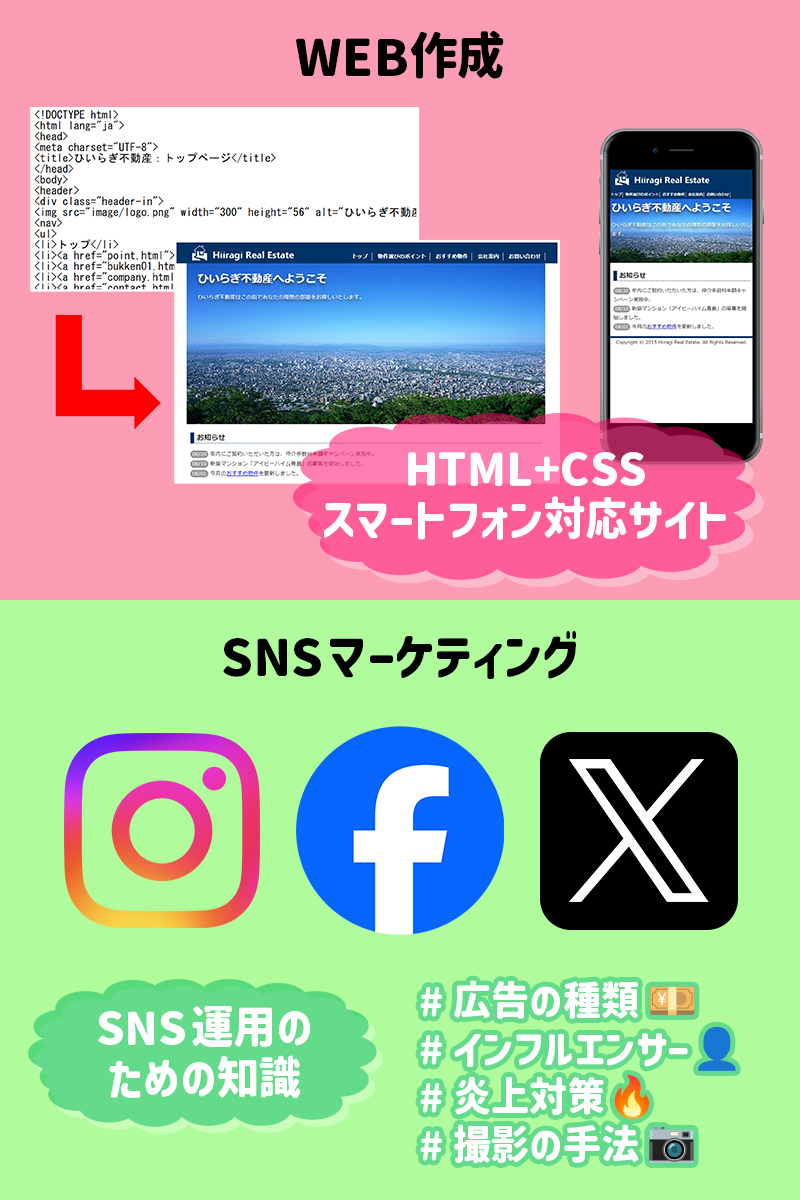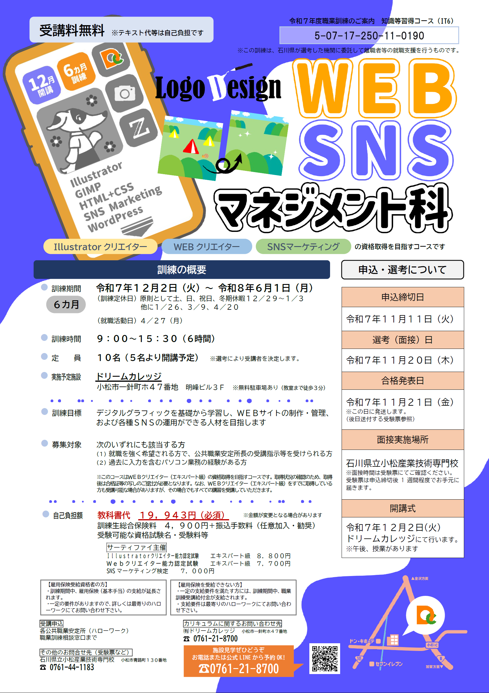 求職中の方を対象に県や国が実施する訓練です。原則として受講料は無料です(テキスト代を除く)。
