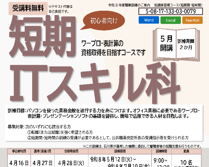 [職業訓練]ITオフィスソフト活用科の受講生を募集中です。