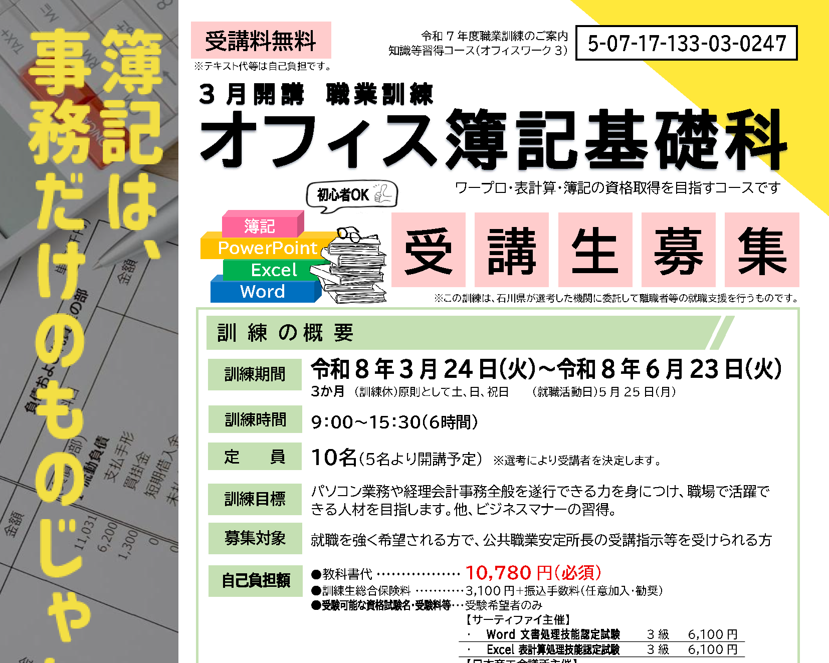 [職業訓練]オフィス簿記基礎科の受講生を募集中です。