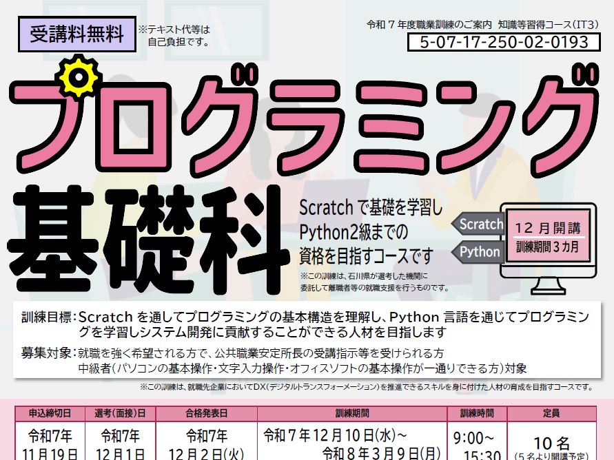 [職業訓練]9月開講 プログラミング基礎科の受講生を募集中です