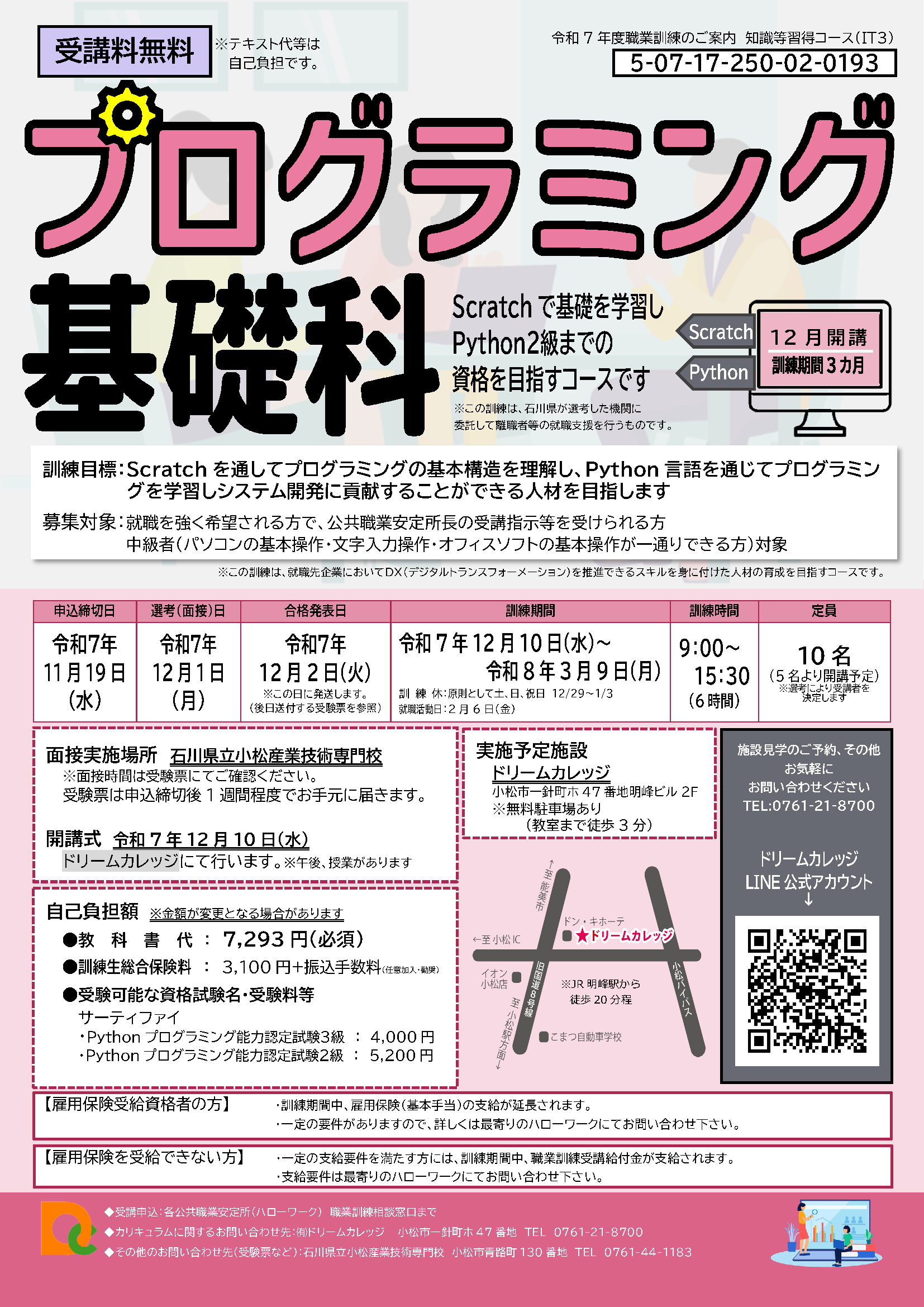 求職中の方を対象に県や国が実施する訓練です。原則として受講料は無料です(テキスト代を除く)。